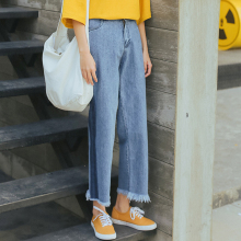 定格,毛边直筒牛仔裤女高腰学生韩国复古文艺宽松bf风九分阔腿裤