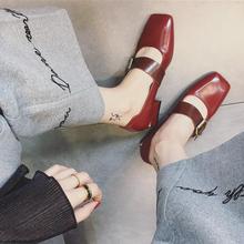 韩版复古中跟玛丽珍鞋一字扣低跟粗跟单鞋女春皮带扣浅口方头女鞋
