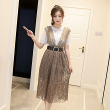 欧洲站夏装新款蕾丝背带裙显瘦高腰宽松时尚连衣裙+针织T恤两件套