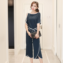 2017夏装新款气质高端修身高腰阔腿裤破袖绑带纯色两件套 潮 女