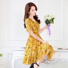 2017夏季新款女装韩版时尚收腰气质雪纺a字裙v领碎花喇叭袖连衣裙