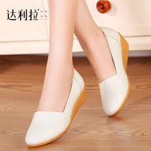品牌女鞋春秋真皮单鞋白色护士鞋方口坡跟皮鞋牛筋软底中年妈妈鞋