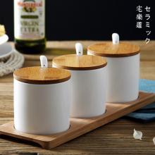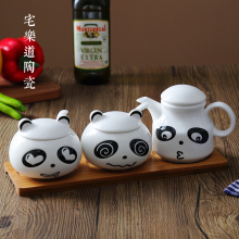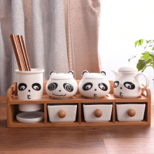 餐厅陶瓷调味罐套装酱油壶卡通可爱熊猫调料瓶佐料盒盐罐糖罐竹盘