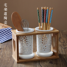 韩式骨瓷陶瓷筷子筒沥水镂空 天然竹木 筷子笼 双筷筒 餐具笼/架