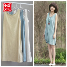 夏季文艺百搭清新中长款宽松肌理棉麻背心裙女无袖打底连衣裙