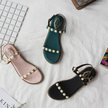 2017韩版珍珠平底凉鞋女夏学生百搭露趾平跟一字扣罗马凉鞋女鞋子