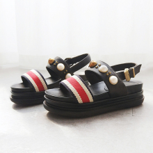 厚底松糕凉鞋女学生2017夏季新款百搭平底漏趾珍珠简约一字带罗马