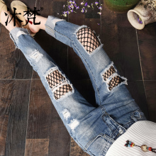 沐梵渔网袜破洞牛仔裤女2017春夏新款大码乞丐裤宽松直筒九分裤潮