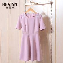 百馨娜2017春款时尚字母印花 镂空收腰简约纯色中高腰 连衣裙