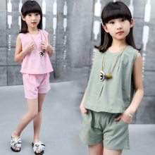 童装2017新款女童夏装套装韩版中大童纯棉无袖T恤棉麻裙裤两件套
