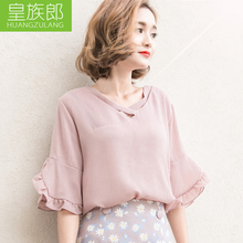 夏季雪纺衫女短袖2017夏装新款韩版百搭中长款仙气质荷叶边上衣服