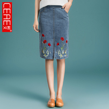 高腰牛仔裙半身裙女中长款包臀裙春夏2017新款韩版前开叉刺绣中裙