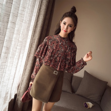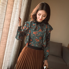 2017新款春秋印花宽松荷叶边打底衫韩版复古碎花雪纺衫女长袖上衣