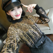 立领衬衫女长袖开衫韩范名媛宽松大码性感透视蕾丝打底衫镂空上衣