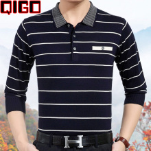 2016秋季中老年男装翻领条纹长袖t恤商务中年大码体恤针织打底衫