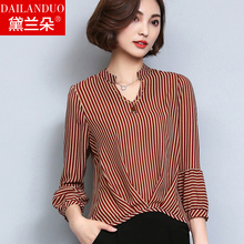 条纹衬衫女2017春装新款韩版修身雪纺衫女七分袖打底小衫上衣衬衣