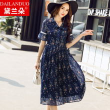 2017夏装新款韩版复古碎花雪纺连衣裙女短袖显瘦印花中长款百褶裙