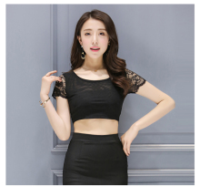 夏装半截打底衫女装短袖大码网纱半身短袖t恤黑色圆领蕾丝打底衫