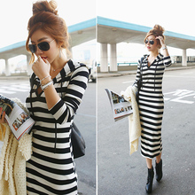 春季女装条纹卫衣加绒长裙纯棉修身显瘦长袖休闲连帽连衣裙中长款