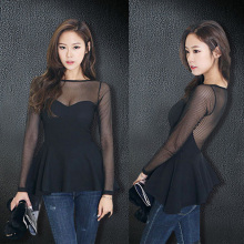 春季新款打底衫长袖条纹性感露背女上衣黑色网纱修身T恤荷叶下摆
