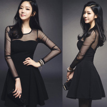 春季女装长袖透视网纱连衣裙拼接露背夜店性感打底修身a字百褶裙