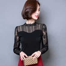 2017春秋新款加绒高领蕾丝打底衫女百搭修身长袖t恤网纱大码上衣