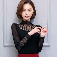 2017春新款蕾丝打底衫女长袖T恤立领百搭镂空网纱衣泡泡袖薄小衫