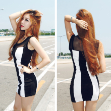 夏季黑白条纹包臀连衣裙性感低胸修身打底裙透视网纱无袖背心裙女