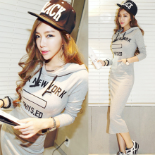 春秋季韩版连帽卫衣裙中长款连衣裙长袖纯棉连帽修身休闲打底长裙