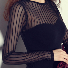 性感网纱打底衫长袖春季新品条纹拼接露背上衣透视大码蕾丝t恤潮
