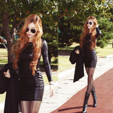 2017春装新款长袖连衣裙春秋修身显瘦包臀裙PU皮黑色秋冬打底裙潮
