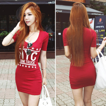 性感低胸修身字母印花连衣裙女夏 短袖休闲包臀显瘦打底裙短裙棉