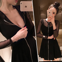 性感蕾丝连衣裙春黑色紧身打底裙长袖 夜店低胸透视网纱拼接a字裙
