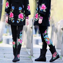 2016春秋民族风大码女裤绣花打底裤刺绣唐装高弹力显瘦小脚铅笔裤