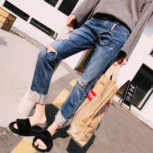 2017春季新款破洞牛仔裤女蓝色欧洲站中腰宽松显瘦翻边九分垮裤潮