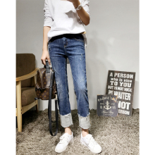 欧洲站17春季新款翻边牛仔裤女宽松拼色时尚直筒裤显瘦九分裤女潮