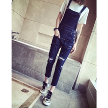 欧洲站2017春新款深蓝色垮裤连体背带裤破洞哈伦裤九分牛仔裤女潮