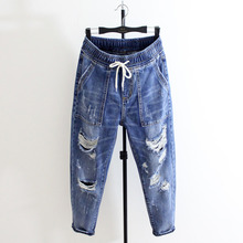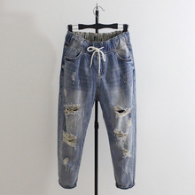松紧腰九分哈伦裤牛仔裤女破洞宽松八分加肥加大码bf垮裤胖mm薄款