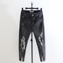 2017大破洞九分裤哈伦裤八分牛仔裤女宽松小直筒珍珠卷边垮裤乞丐