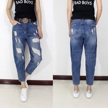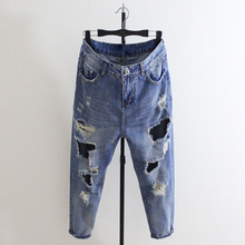 2017新款大破洞哈伦加肥加大码牛仔裤女宽松九分裤显瘦乞丐垮裤潮