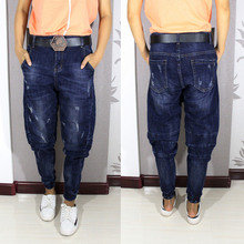 女大号休闲宽松显瘦大码小脚哈伦牛仔长裤加肥加大吊裆垮裤胖mm潮