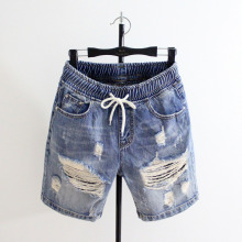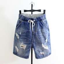2017夏季新款破洞加肥加大码宽松牛仔裤女抽绳哈伦短裤松紧腰垮裤