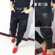 女2016秋冬显瘦哈伦牛仔裤大码宽松弹力垮裤深色学生小脚长裤潮bf