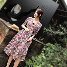 V领收腰系带清新小碎花连衣裙印花夏中长款高腰大摆花裙子七分袖