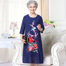 奶奶夏季新款短袖中长款连衣裙50中老年女装宽松60民族风棉麻裙子