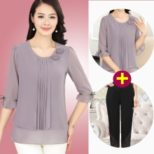 中老年女装夏装中年人40-50岁中袖T恤两件套宽松妈妈装雪纺衫套装