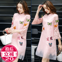 2017春季新款韩版时尚女装立领盘扣立体瑚蝶刺绣欧根纱蕾丝连衣裙