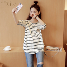 孕妇t恤短袖时尚夏季条纹孕妇上衣大码棉质打底衫中长款孕妇夏装