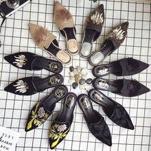 2017新款穆勒天鹅丝绒面3D刺绣花瓣尖头包头平底女鞋半拖鞋懒人鞋