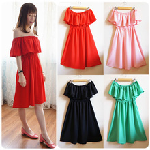 夏季韩版小清新一字领露肩荷叶边抹胸纯色沙滩连衣裙短裙吊带裙棉